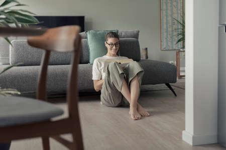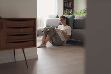Happy woman with glasses sitting on the floor at home and reading an interesting book