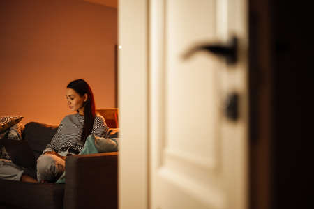 Young woman pretty relaxing on couch in living room. Casual style indoor shoot