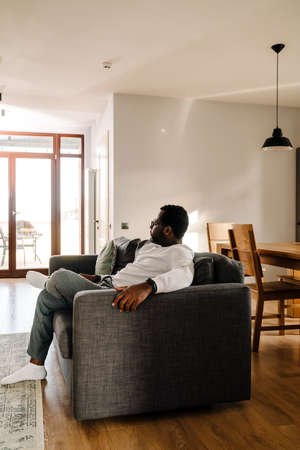 Black man wearing eyeglasses watching tv while resting on sofa at home