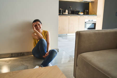 Front view of a cheerful dark-haired Caucasian pretty lady leaning against the wall in the room