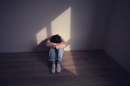 Woman sitting alone on the floor, head in her arms, depicting loneliness and depression. Mental health awareness and emotional struggle concept.