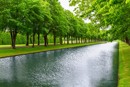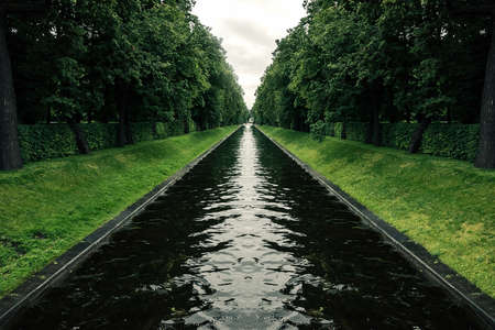 canal in the Park of symmetry between the trees on a cloudy day