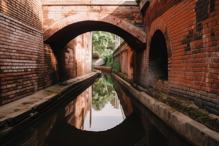 water channel with bridge and brick walls in industrial style, created with generative ai