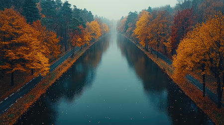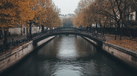 This captivating image showcases a tranquil waterway flanked by ancient archways, reflecting enchanting autumn colors and creating a serene atmosphere for viewers.