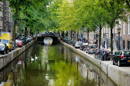 AMSTERDAM - AUGUST 2011: Famous canals of Amsterdam, Netherlands. Cars and bicycles parked on the embankments. Typical street view in Amsterdam, Holland.