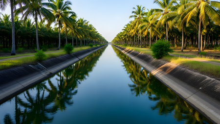 A symmetrical perspective of a long irrigation canal flanked by rows of tall coconut palm trees. The calm water reflects the greenery and clear blue sky, creating a peaceful tropical agricultural landscape.