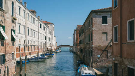View of canal between Venetian houses in Venice, Italy