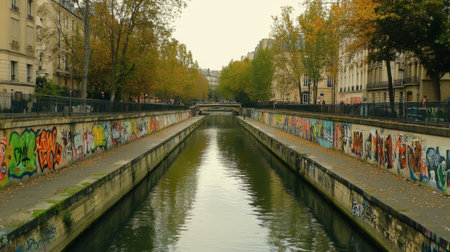 A tranquil urban canal showcasing vibrant graffiti art on its banks, framed by golden autumn trees. This serene landscape captures the essence of city life.