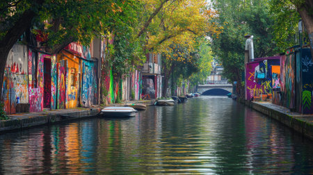 A picturesque urban canal featuring vibrant graffiti art on buildings, tranquil water reflecting colors, and boats nestled along the serene waterway.