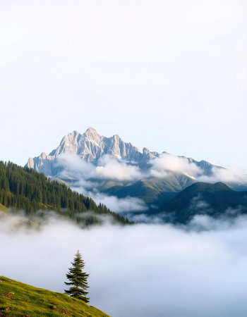 Mountain landscape in the clouds on a foggy day, Switzerland