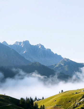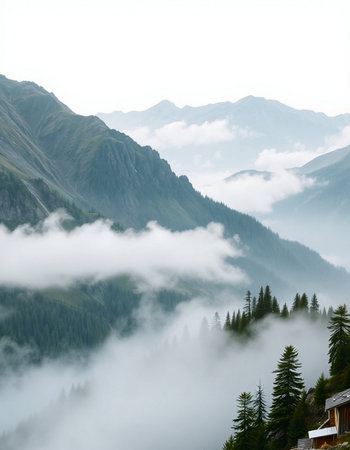 Mountain landscape of the Swiss alps on a foggy day