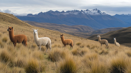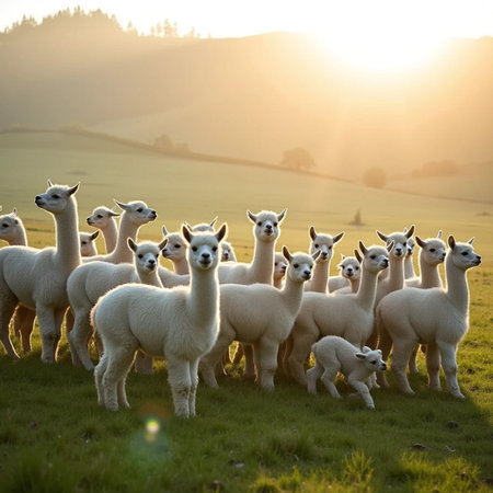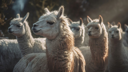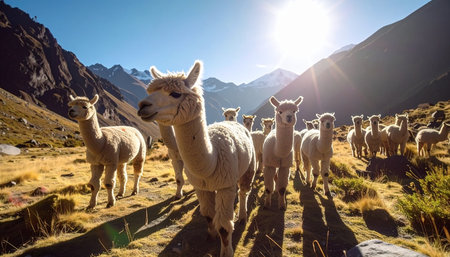 A curious herd of alpacas greets the morning sun high in the Peruvian Andes. Bathed in the golden light of dawn, these gentle creatures traverse the rugged mountain landscape, embodying a spirit of wild freedom and serene adventure in a remote, breathtaking wilderness.