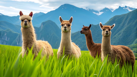A small herd of alpacas grazing on a hillside, surrounded by tall grasses and distant mountains. The peaceful scene is free from any human presence.