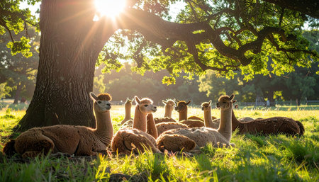 As the day draws to a close, a gentle herd of alpacas finds tranquility in the warm, golden glow of the setting sun. They rest together in the lush grass beneath the sprawling branches of an old oak tree, a perfect picture of pastoral peace and rural contentment.