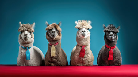 Generative AI, Group of positive different colors Lamas, funny animals. Individuality, independence, think different, creative idea, diversity and inclusive concept.