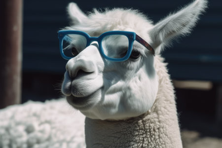 Portrait of a white alpaca with blue eyeglasses