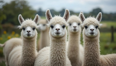 Four fluffy white alpacas gaze directly at the camera in a lush green pasture