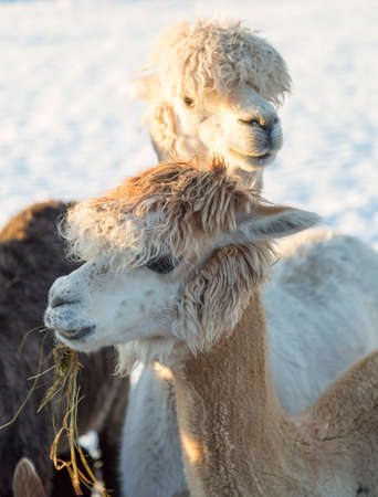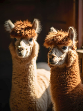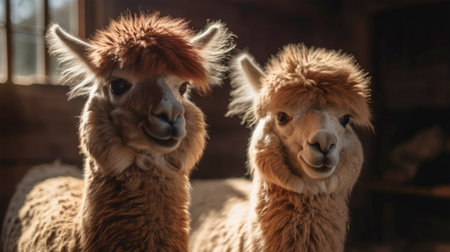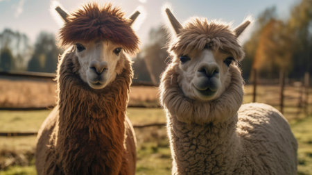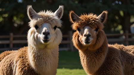 Close-up of two adorable alpacas with fluffy fur and expressive faces