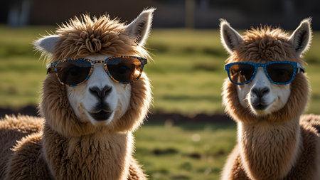 Comical funny Alpacas in a village farmyard, wearing sunglasses