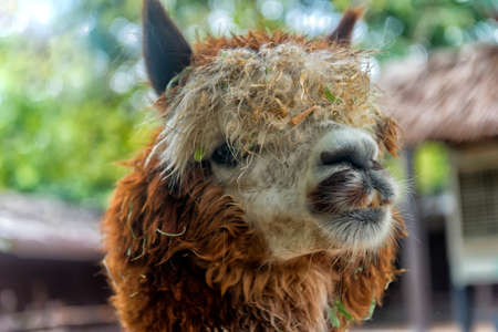 A picturesque scene, a brown llama in a pen. The concept of animal husbandry and rural life. Portrait of a smiling lama in the fresh air. Close-up. A pet on a private eco-farm. Agricultural industry.