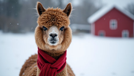 Festive alpaca in winter scarf in snow field