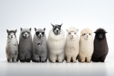 Generative AI, Group of positive different colors of alpacas or lamas, funny animals. Individuality, independence, think different, creative idea, diversity and inclusive concept.