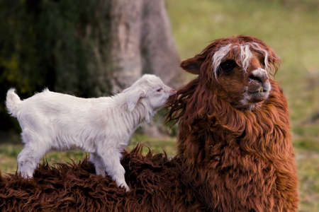 Young goat playing with alpaca
