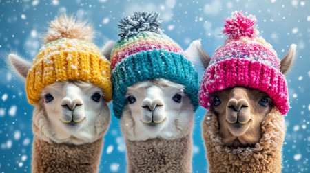 Colorful winter hats adorn charming alpacas against a vibrant blue background with falling snowflakes