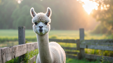 AI Generated. Soft light of sunrise illuminates curious alpaca near wooden fen