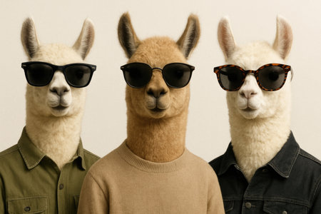 Three llamas wearing sunglasses on a light background