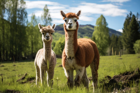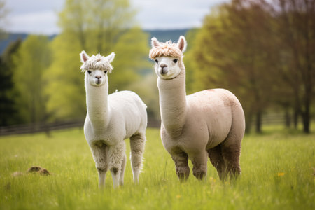 Pair of alpacas grazing peacefully in a grassy field. Their soft woolly coats and serene expressions adding charm to the pastoral scene. Two fluffy happy animals having a walk in field. Generative AI