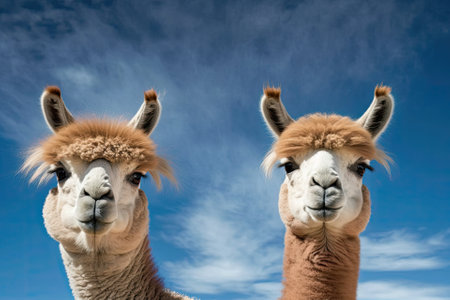 A picture of two alpacas in front of a blue sky. Camelid from South America. Generative AI