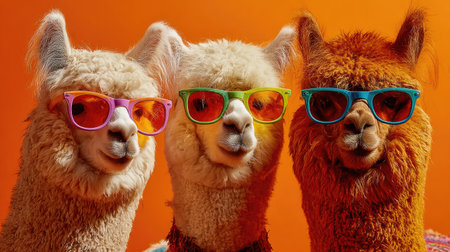 Three llamas are the central focus, each sporting sunglasses against a vibrant orange backdrop. The composition is brightly lit with a focus on color and texture. The image lends itself to potential use in various advertising and editorial contexts, appealing for its cheerful and eye-catching aesthetic.