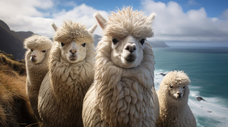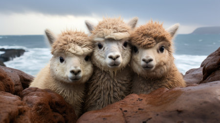 Group of alpaca on the coast of ocean