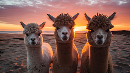 Group of alpaca on the beach during sunset. Alpaca