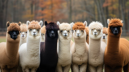 A group of eight alpacas stands in a row against a backdrop of vivid autumn foliage and rolling mountains. Their diverse fur colors contrast beautifully with the serene landscape.