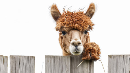 Funny alpaca hanging on a fence. Isolated on white background. fawn alpaca Lama pacos