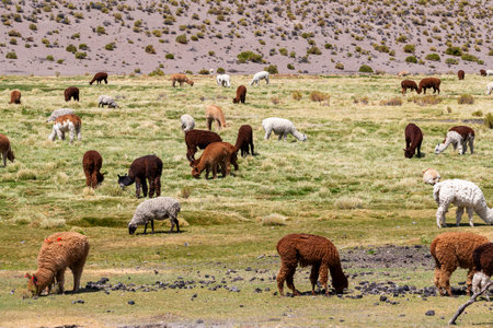 Herd of brown and white alpacas grazing