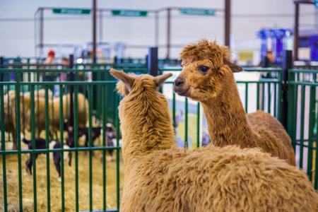 Portrait of alpacas at agricultural animal exhibition, trade show. Farming, agriculture industry, livestock and animal husbandry concept