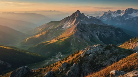 Mountain landscape at sunrise. View from the top of the mountain range.