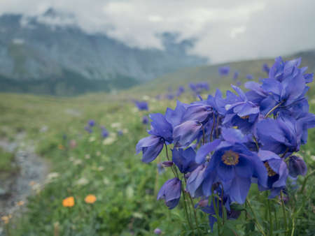 Beautiful alpine meadow with blooming wildflowers in summer