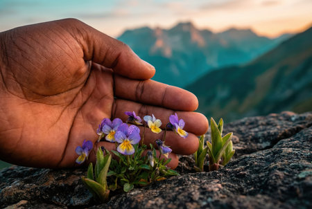 Hand gently touching wildflowers on mountain rock.