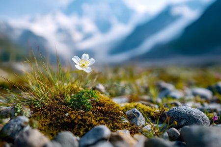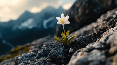 A fragile bloom emerges from rugged stones, set against a softly blurred mountain range that enhances its resilience and understated beauty.