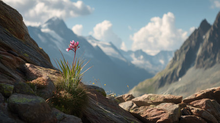 A delicate pink flower stands out on rocky terrain, framing a breathtaking mountain landscape. The scene captures nature's beauty amidst a serene environment, showcasing intricate details.