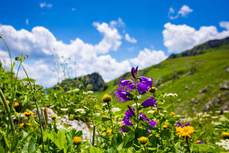 Swiss Alps Valley with Flowers. Campanula cochleariifolia wildflower in Alp meadow landscape. Beautiful view of idyllic alpine mountain scenery with blooming meadows on a beautiful sunny summer day.