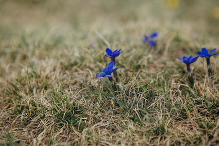 Blooming Gentiana verna in the summer. Flowering blue spring gentian in Dolomites. Italy.