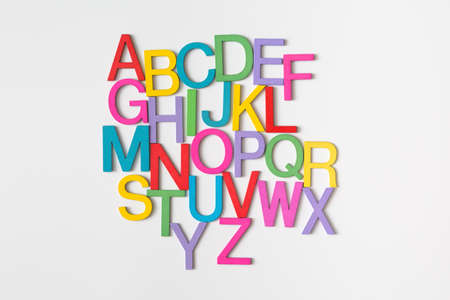 Colorful wooden english letters A-Z on white background and copy space for educational and graphic concept