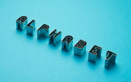 Alphabet word written with cookie cutters molds over blue background