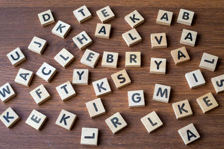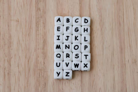 Text dice cube concept / Letter dices alphabet on wooden background. Block of alphabet studded on the floor.
