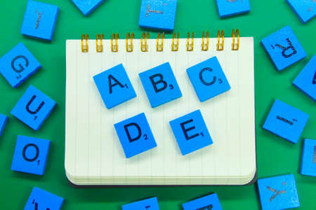 notebook and the letters abc on the blue square. learning concept